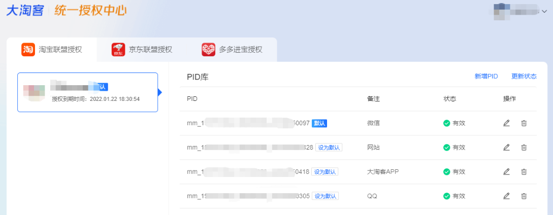 升级完成后,将支持淘宝联盟、京东联盟、多多进宝授权,每个平台的授权都支持授权多个账号。如:您可以在选品库转链时使用其中一个授权,大淘客CMS使用另一个授权,独立APP使用其它授权。
