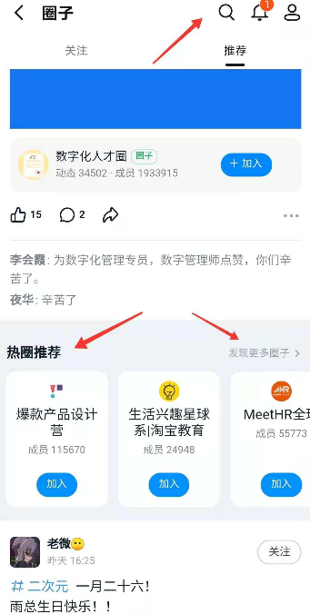 2、进入圈子后下拉里很多推荐的热门圈子,或者右上角放大镜去查关键词,选择想要的圈子直接加入即可