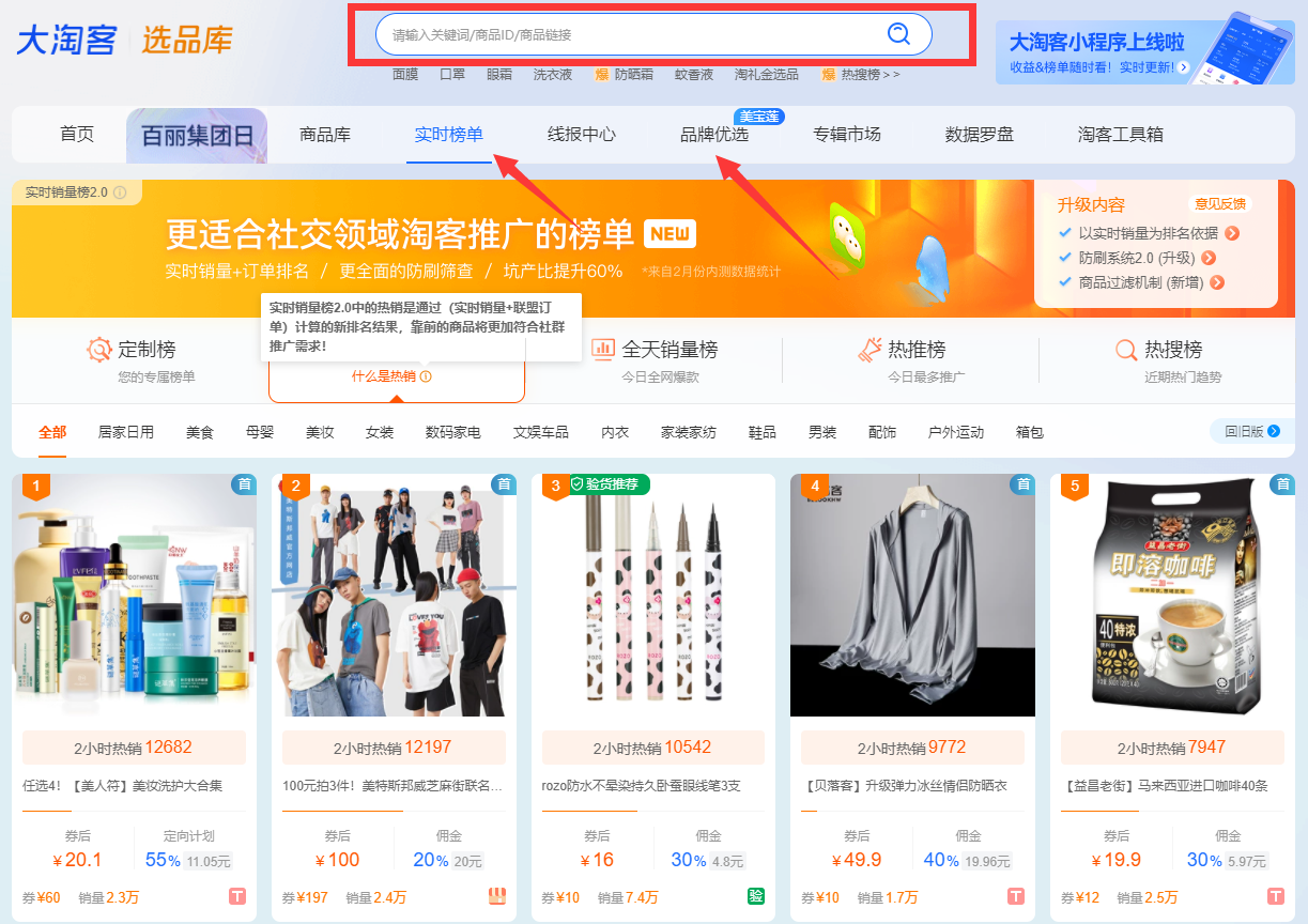 大淘客、淘宝联盟都可以选品,榜单都是出单量很高的商品,想要推品牌的商品,可以在品牌优选里面选择,或者是通过搜索框筛选要推的商品。
