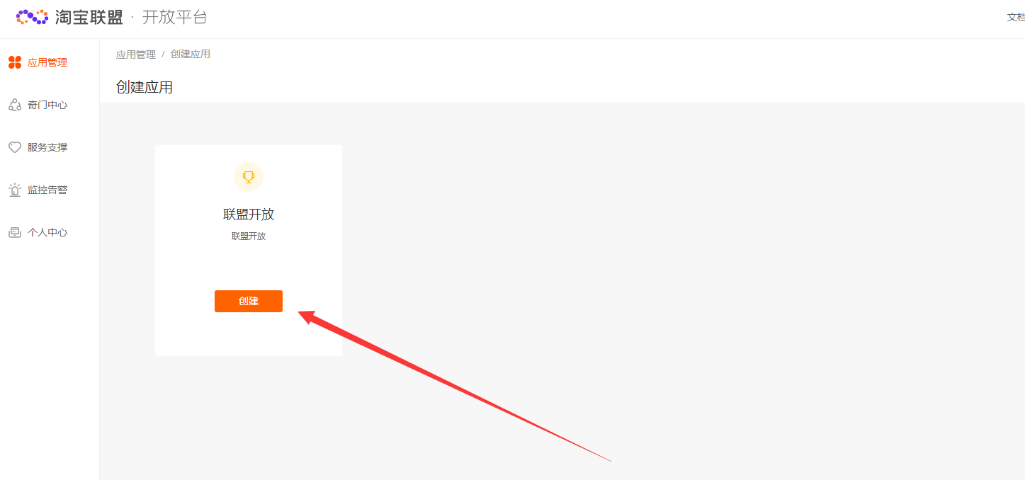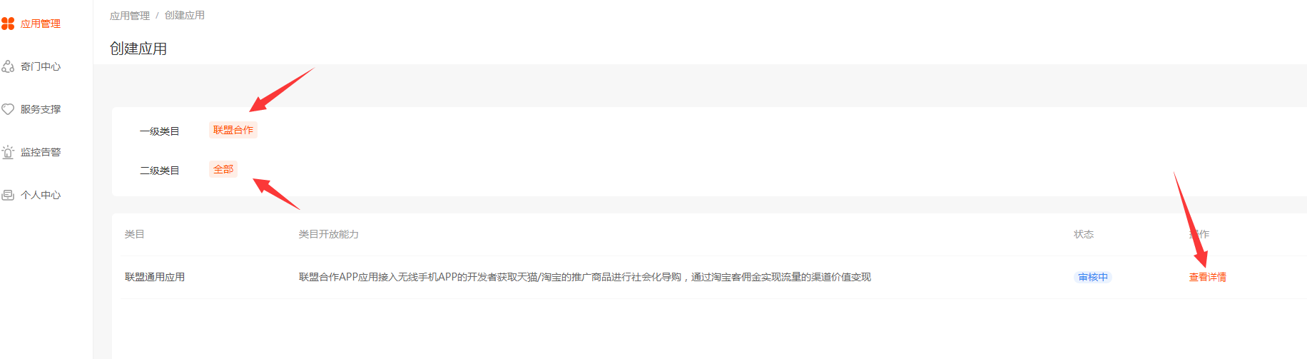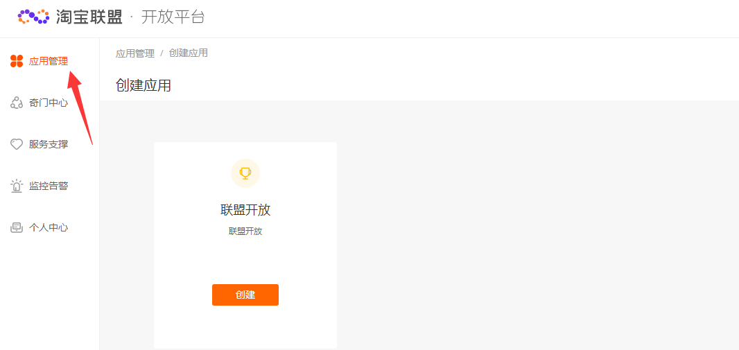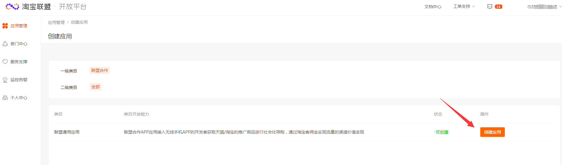 2)点击创建应用>选择联盟合作>点击申请(下图2)(通常5分钟内审核通过)