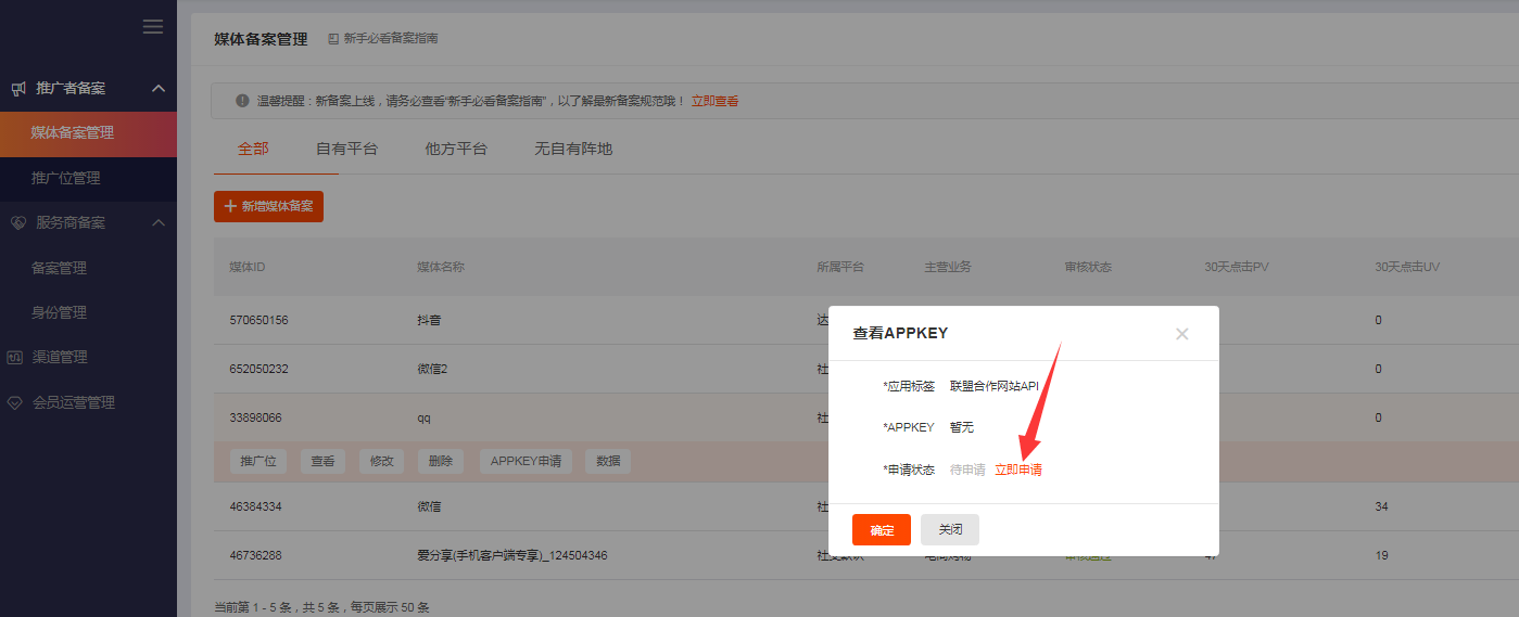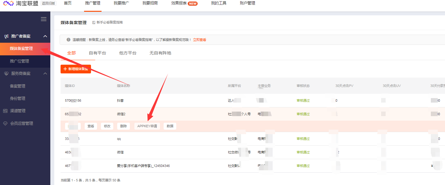 1)淘宝联盟后台>媒体备案管理,选择一个媒体名称的APPKEY进行申请(下图2)
