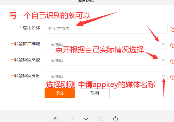 3)审核通过后,点击创建应用,按照下图2选择对应的推广阵地、备案类型、备案身份,最后提交即可。