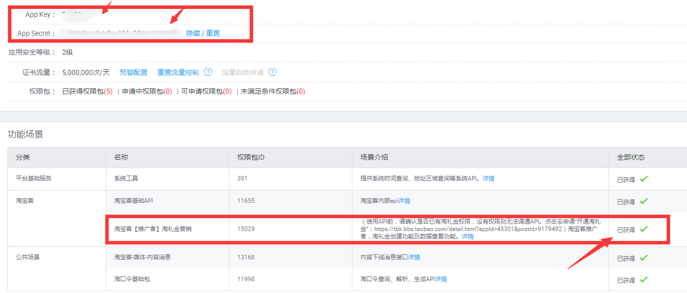 5)点击管理(下图1),获得App Key和App Secret,并且申请淘礼金营销权限(下图2)