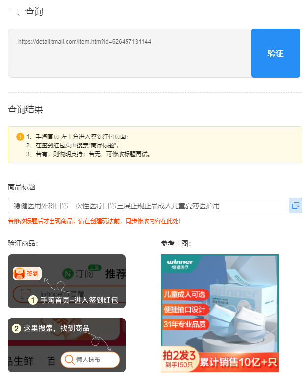 复制商品到签到红包工具进行验证,然后复制商品标题到淘宝app-左上角签到红包页面搜索,在签到页中如果有该商品,则说明支持签到红包,如果始终找不到则说明不支持签到红包。