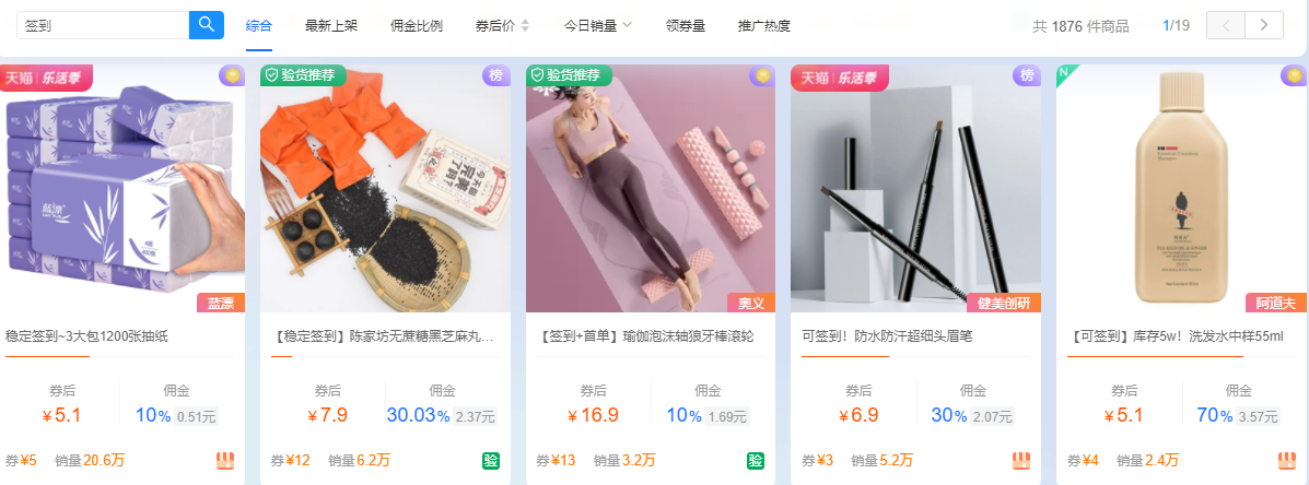 在中间页中,会有两个淘口令,1个是商品的二合一链接,用户需要领券加购物车(不下单);第2个是签到页的搜索结果,用户需要在此页找到商品(下单)。