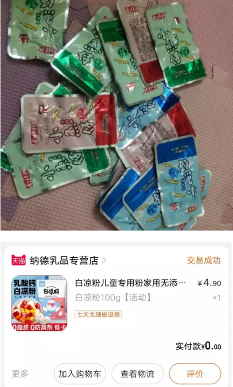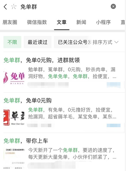 文章一般都是简单无脑的免单截图,一种是实物图片、另一种是订单图片。然后说些没用的废话,免单群,速度扫码进,秒无,群里已经有很多人了。