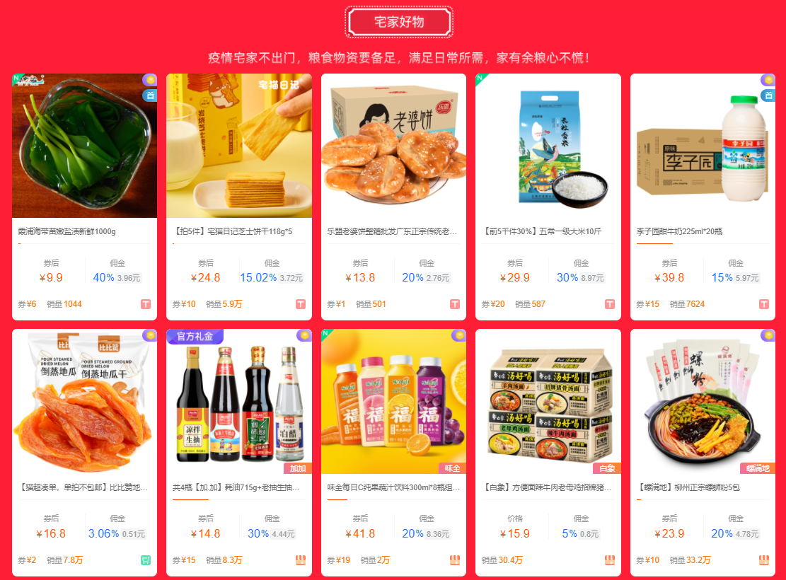 疫情宅家不出门,粮食物资要备足,满足日常所需,集合用户最爱购买的日常用品。