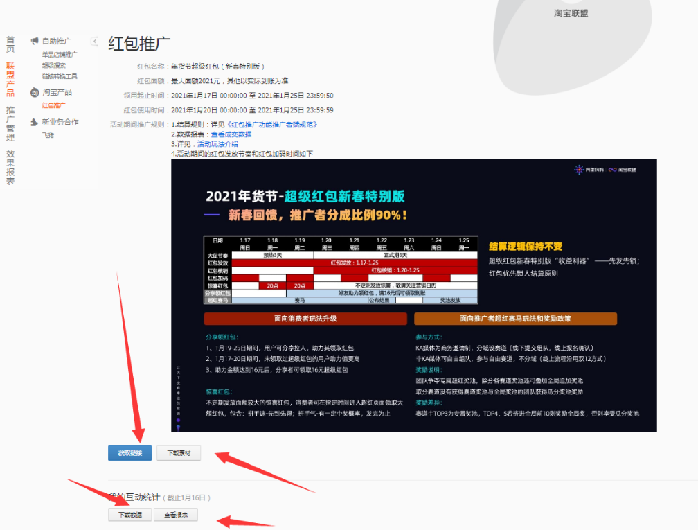 红包推广产品是一种可供推广者在自身渠道发放红包,并按红包推广结算规则享受收入分成的全新推广形式。红包不需要自己出钱,淘客直接在联盟后台取链接推广即可!