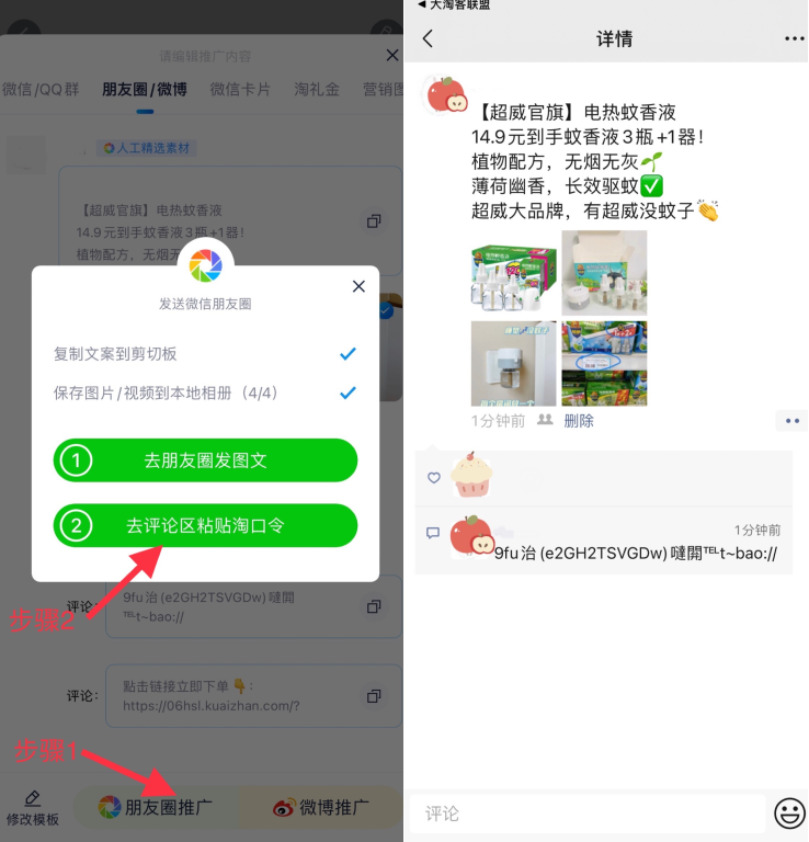 6、返回APP,点击“朋友圈推广”,点击“去评论区粘贴淘口令”,回到已发布的朋友圈评论进行粘贴即可!