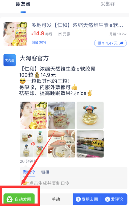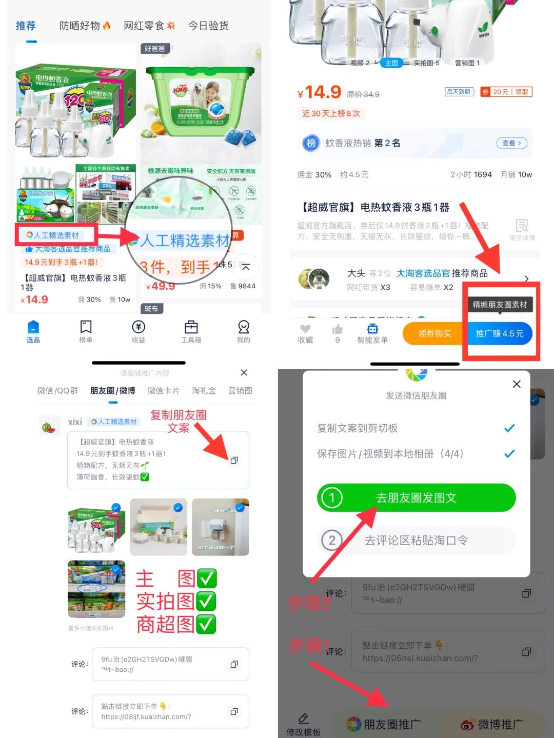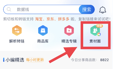 1、首页推荐版块有“人工精选素材”标识的商品,均支持一键发圈;