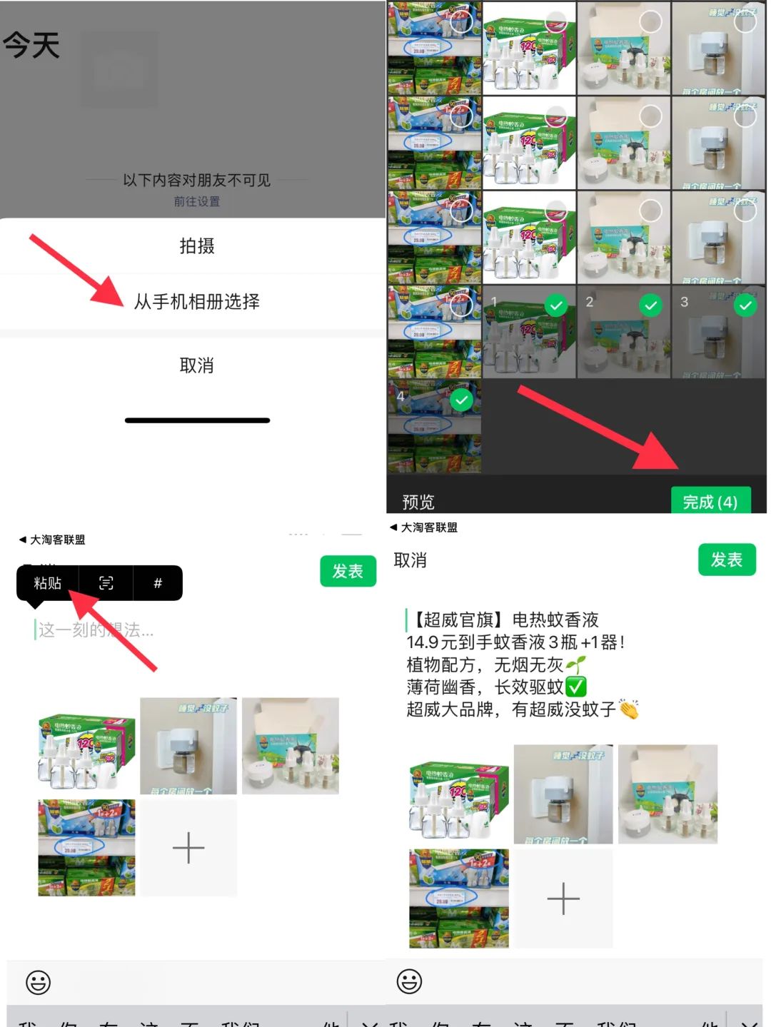5、按照平时发朋友圈流程,从手机相册选择图片,粘贴文案,发表即完成;