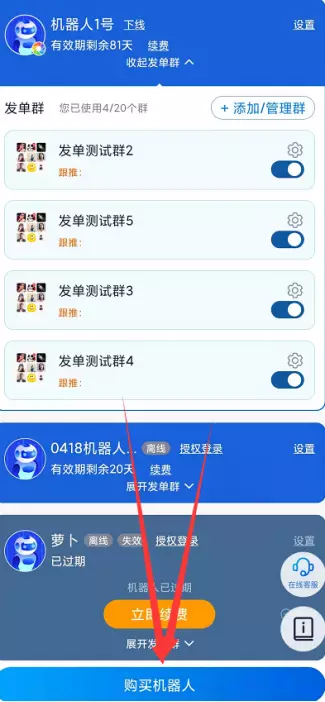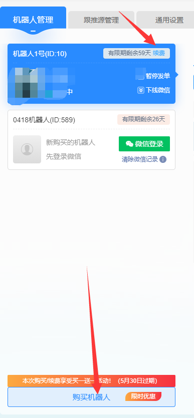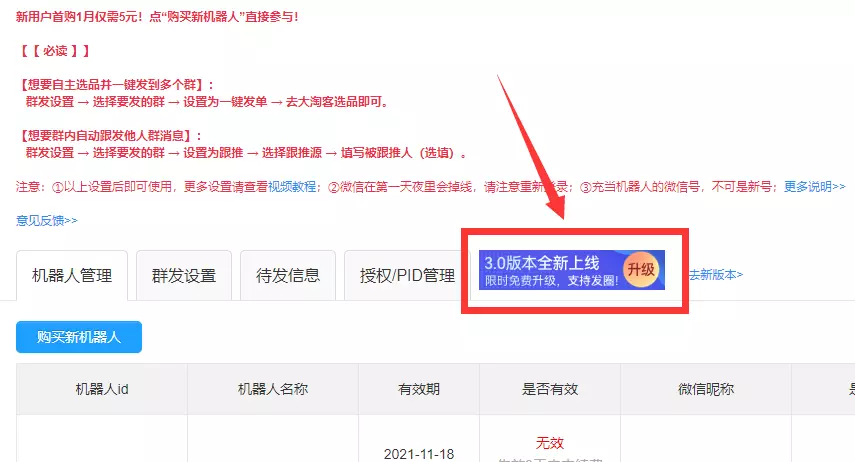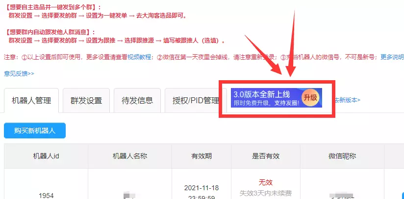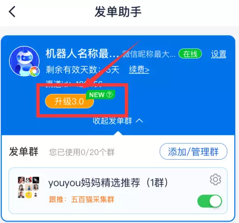 老板发单小助手有效期内用户可享受。在老版本的右上角,有升级入口,可将老版本机器人免费升级至新版本。且根据机器人剩余有效时间,最多赠送30天时长!