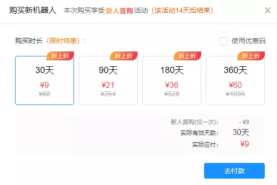 活动价格:30天9元,90天21元,180天36元,360天60元(折5元/30天)