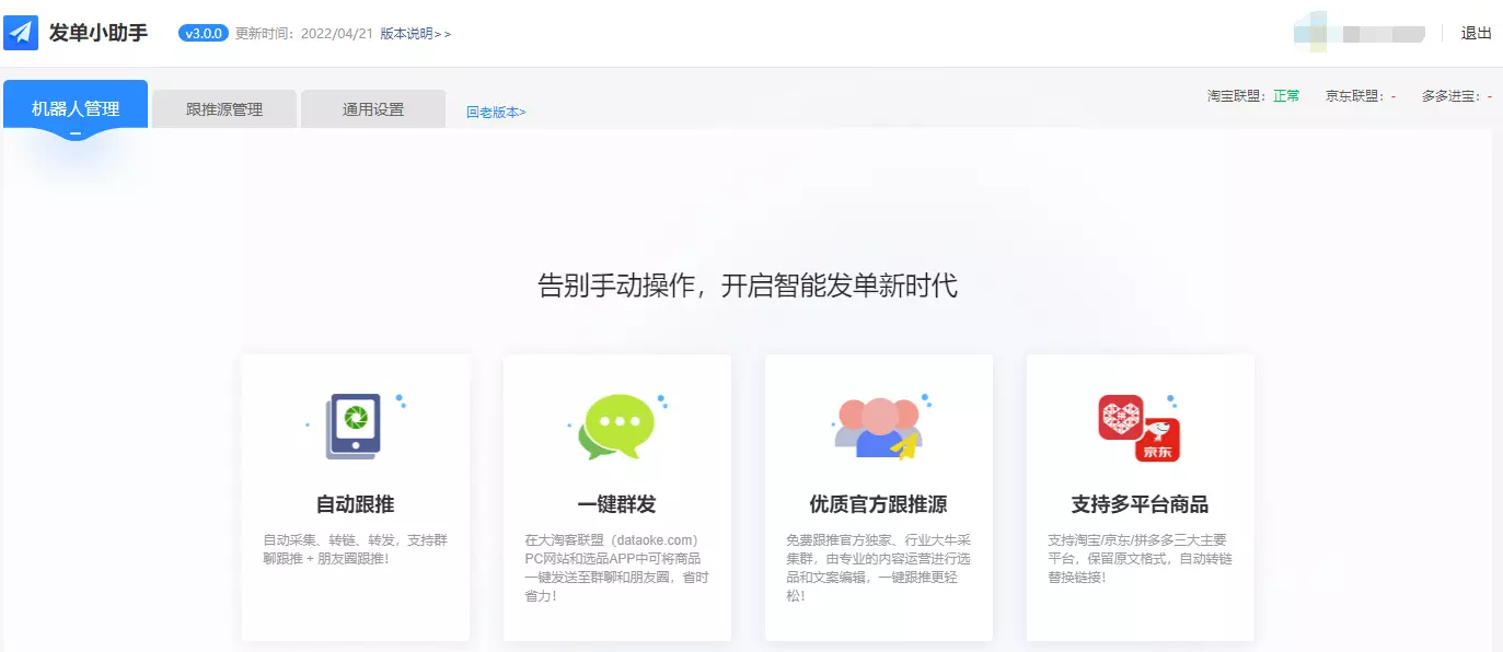 大淘客发单小助手于2020年9月上线至今,不断更新,只为提供更好的服务!此次3.0大升级,不仅有全新的UI界面,更清晰的操作。在技术上同样升级,微信登录、消息发送更稳定,提升微信发单50%效率。