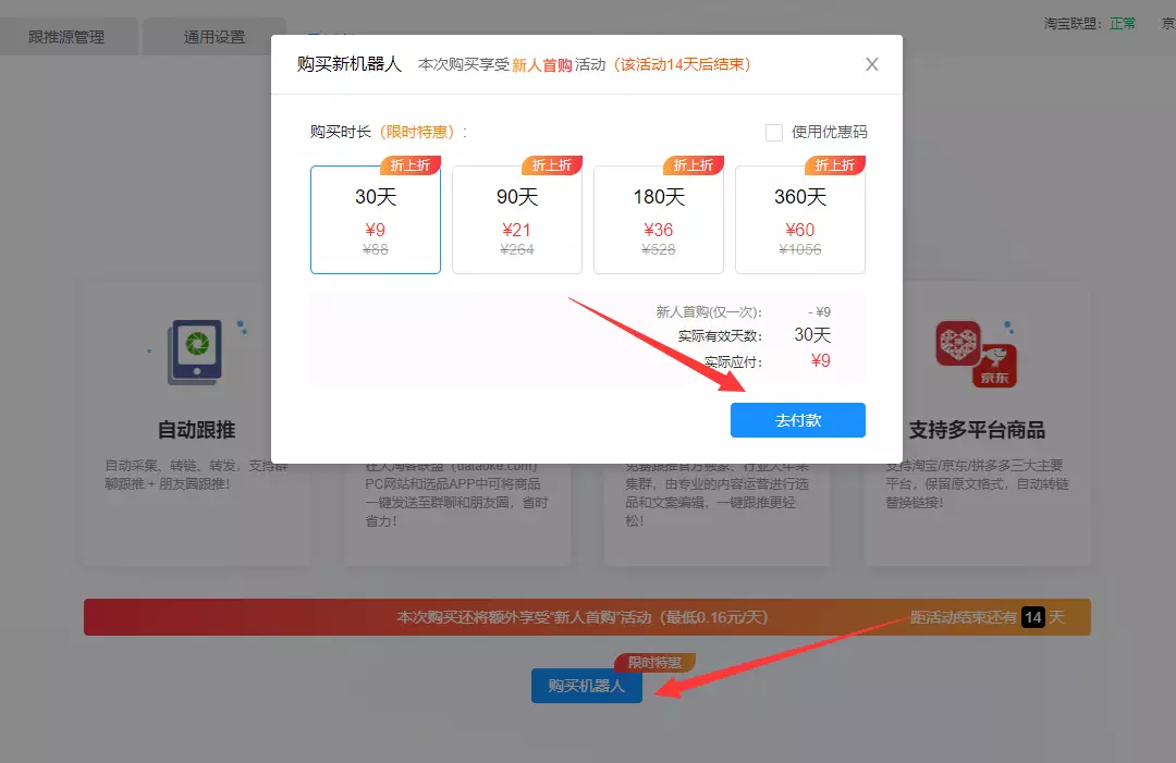 2)新用户:大淘客商品库→淘客工具箱→购买机器人