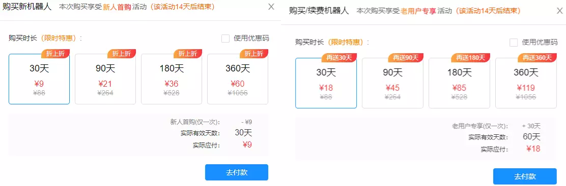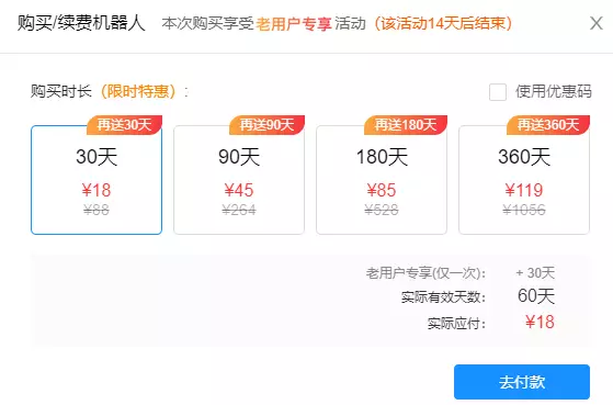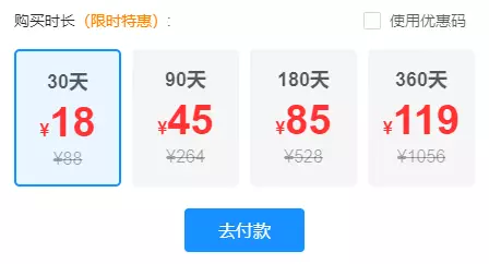 活动优惠:买30天送30天,买90天送90天,买180天送180天,买360天送360天