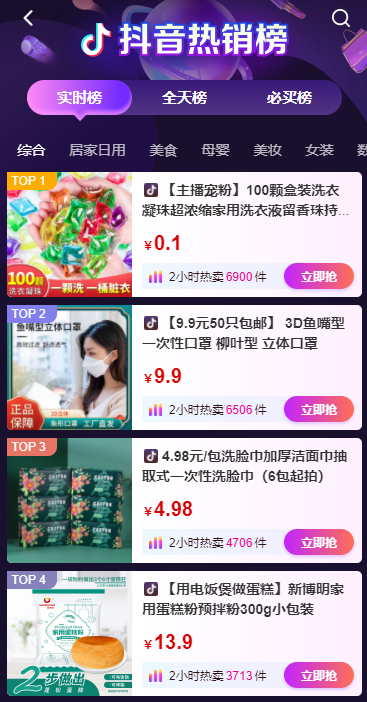 接口返回抖音站外分销商品实时销量榜单(实时销量榜、全天销量榜、必买榜)。建议每5分钟请求一次