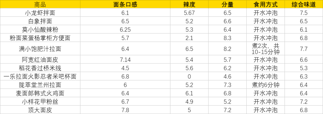 面条口感、辣度、分量、综合味道
