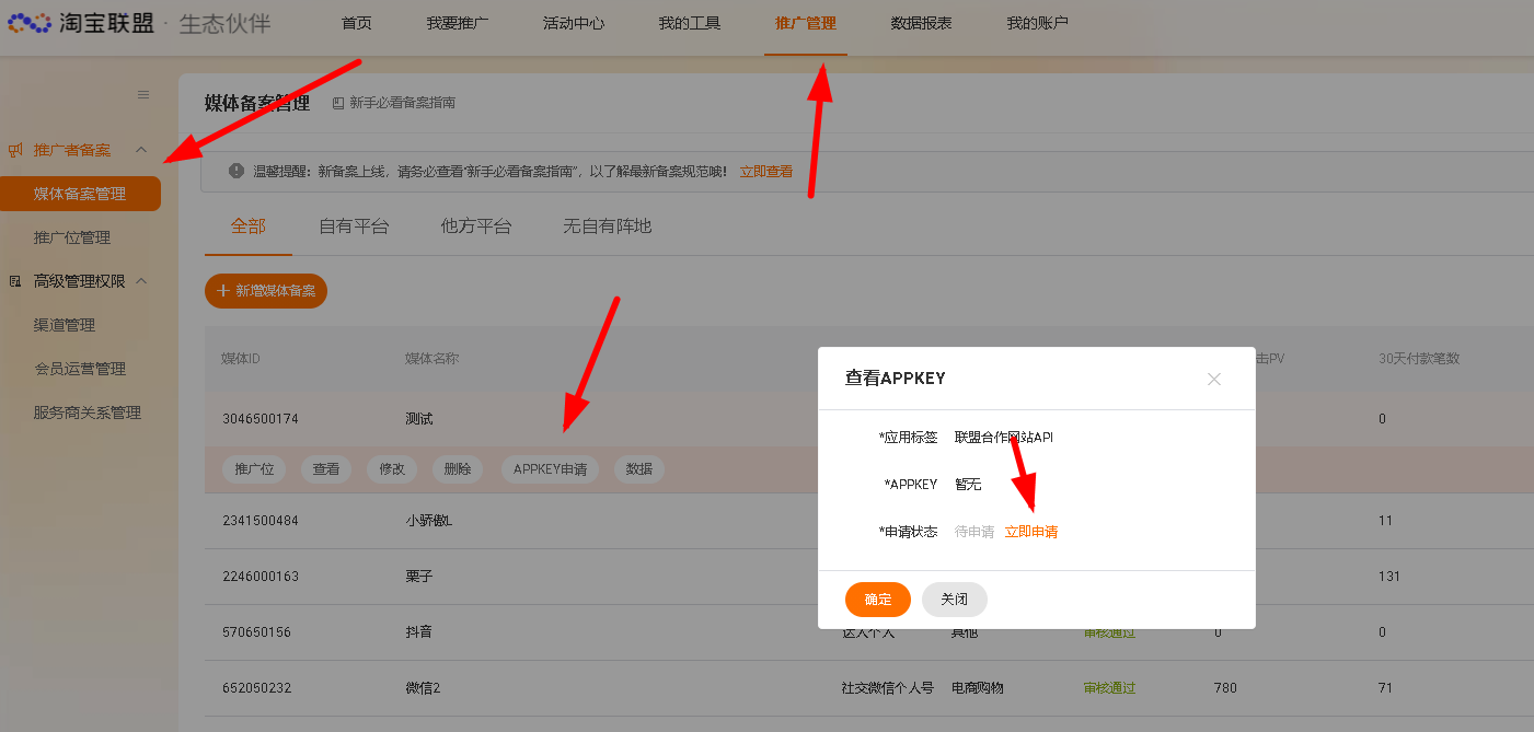 1)联盟后台>推广管理>媒体备案管理>APPKEY申请>立即申请