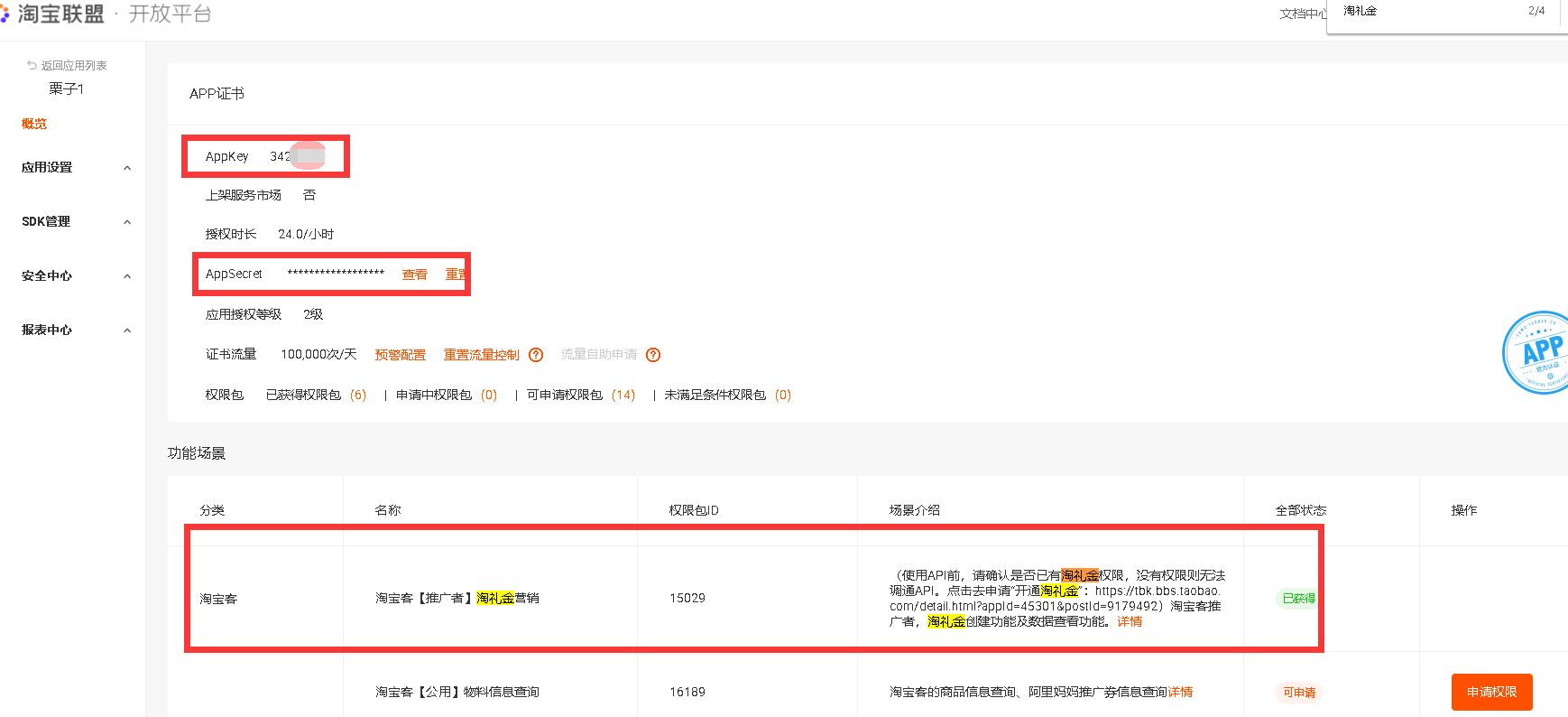 3)获得App Key和App Secret,审核通过后找到淘礼金营销并且申请淘礼金营销权限