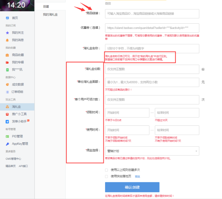 复制商品链接→填写淘礼金名称(便于区分不同商品的淘礼金)→填写淘礼金份数→填写单份淘礼金面额→输入单个用户可以领取几次淘礼金→填写领取时间→使用时间→选择佣金→点击创建即可。