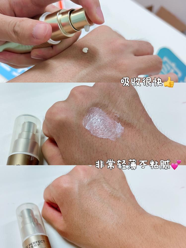 3.使用感受:有点香味;质地比较水润轻薄,很好推开,吸收非常快,清爽不粘腻,成膜速度快,成膜后无粘腻感,非常轻薄.肤感很好,后续上妆也不会搓泥;