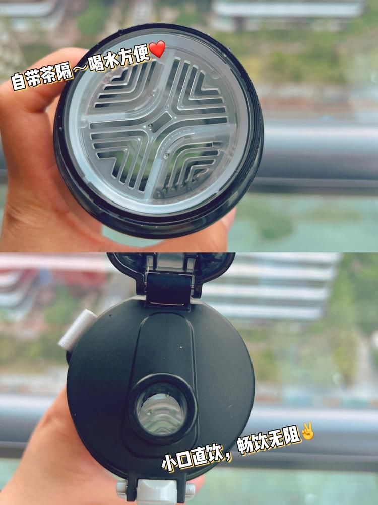 3.使用感受:到手没有任何异味哦,质量很赞!自带安全小锁扣和手提带,携带很方便!有大小两个饮水口,还自带茶隔!整体设计是真的很赞!颜值也很简约,和夏天简直绝配