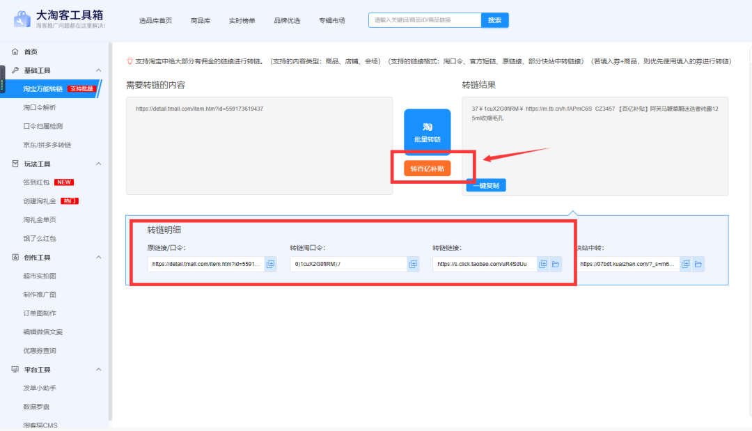 (3)看到一个有百亿补贴的品,可直接复制商品链接,用淘宝万能转链工具点击“转百亿补贴”即可转成自己的链接~