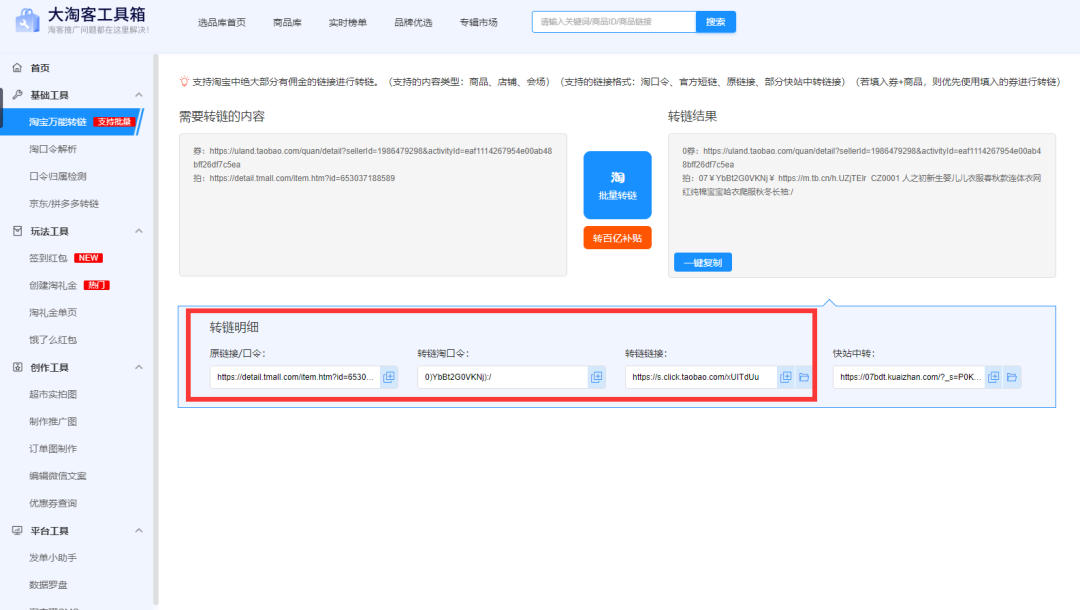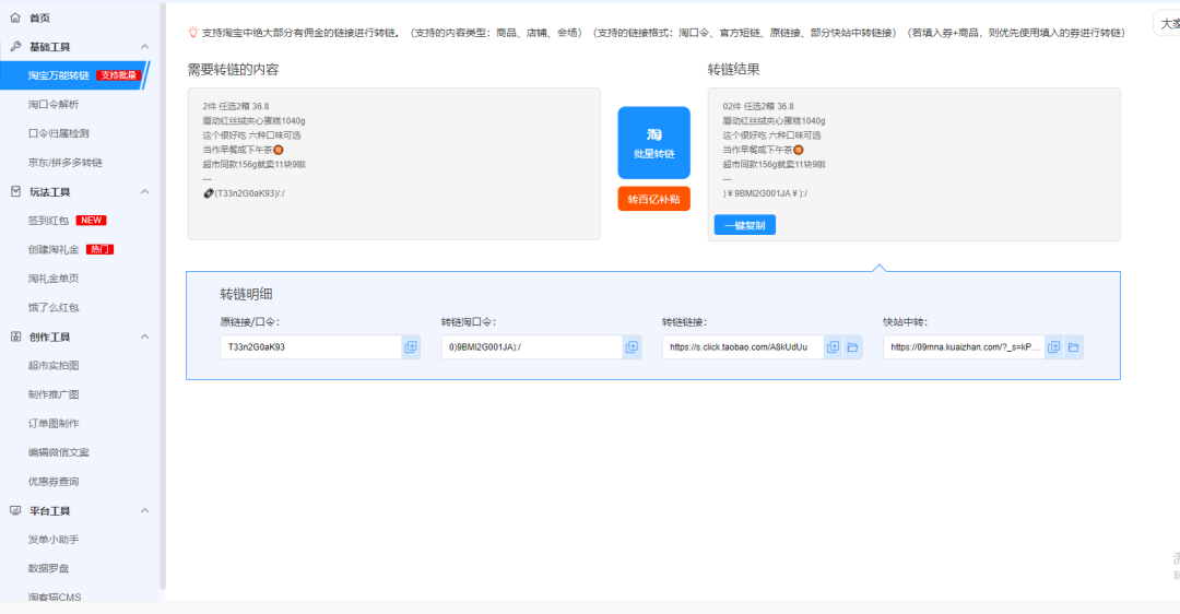 (2)在传统采集群里看到不错的品,可直接复制券+商品链接,用淘宝万能转链工具转链即可获得二合一链接和淘口令~