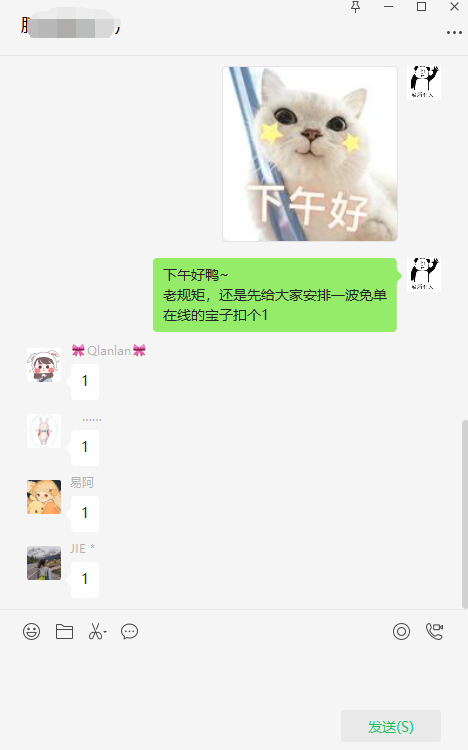 举个例子吧,我们在免单开始前会先活跃群的气氛 让买家扣个1,然后根据活跃人数设置一定量的淘礼金免单商品。最后让买家截图抢到了0元免单商品发到群,这样就会达成活跃群的目的。