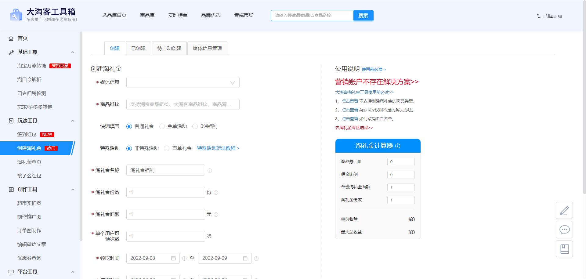 2、创建淘礼金