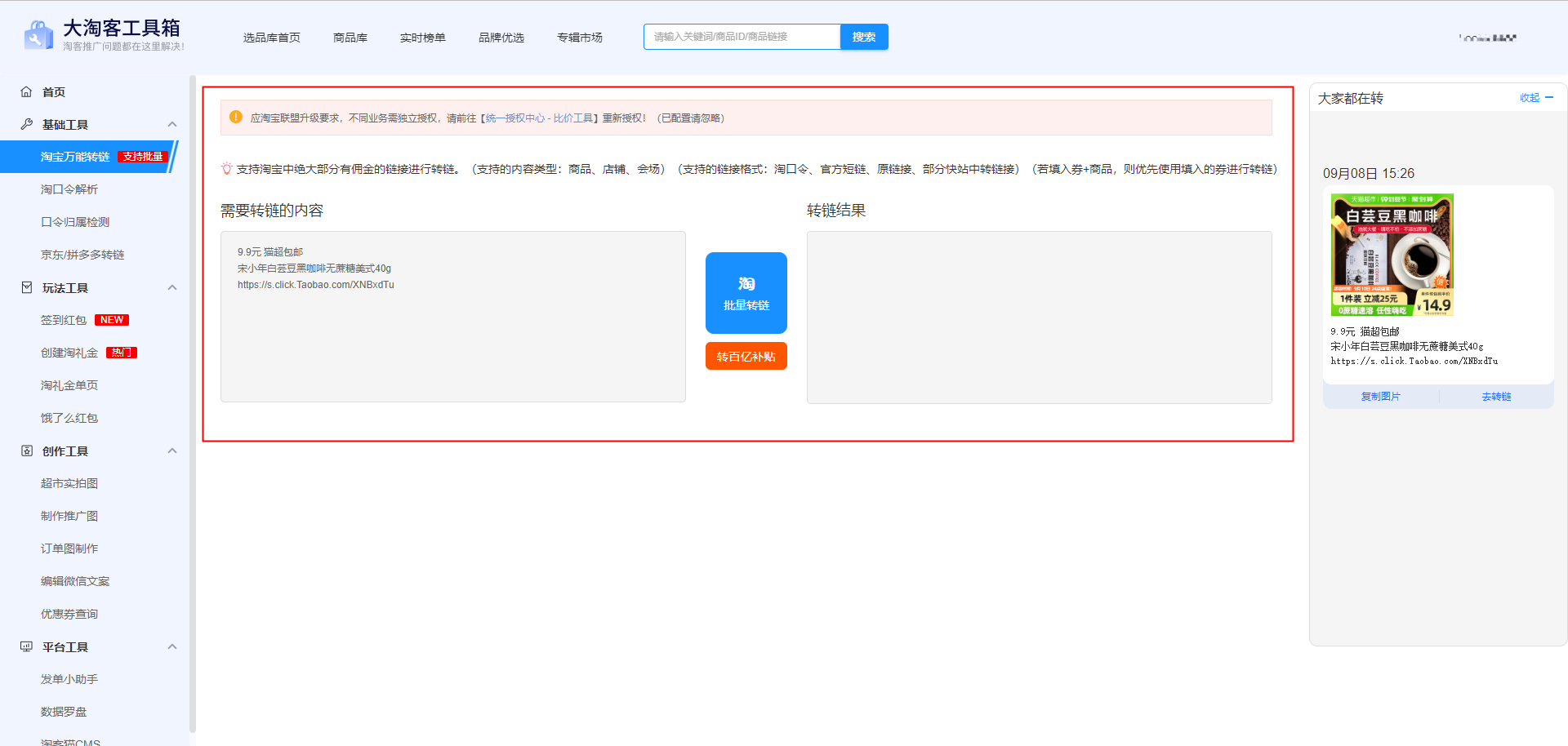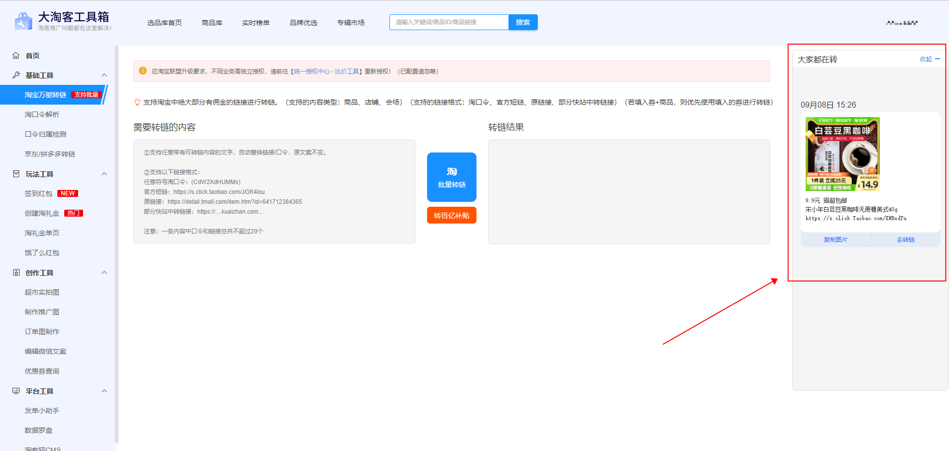 淘宝万能转链工具页面新增“大家都在转”,方便淘客们在工具箱转链时去甄选一些高佣低价、热推的商品,节省了选品的时间!