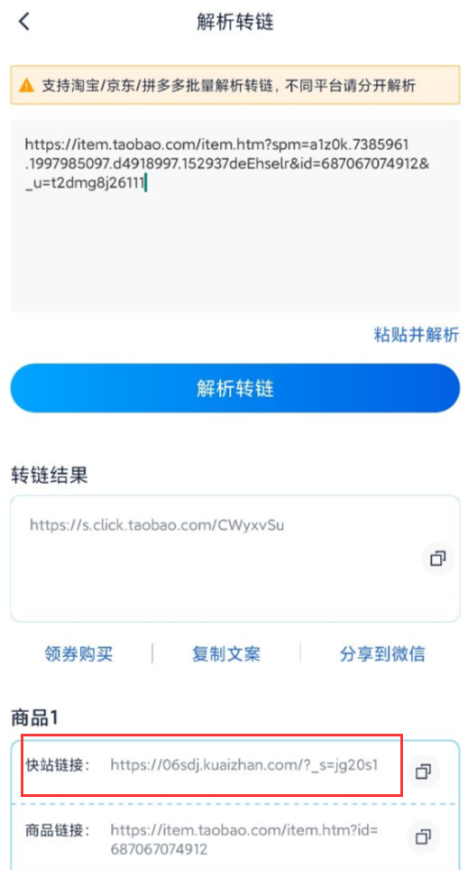 非大淘客的商品可用app的解析转链工具转链生成快站链接,复制商品口令、链接即可转链。