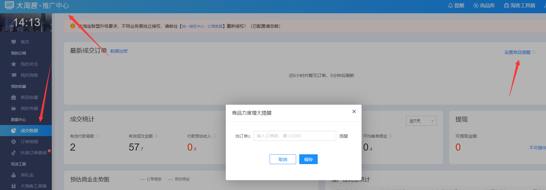 设置:大淘客推广中心-成交数据-设置商品提醒