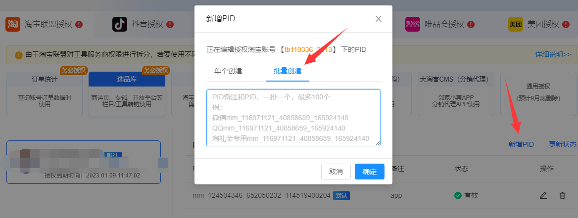 添加格式:PID备注和PID,一行一个(例:淘礼金专用mm_1246845246_35742532_11652486434)