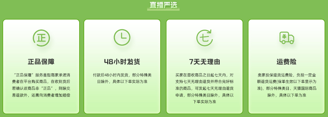 正品保障、48小时发货、7天无理由、运费险,消费者要的安心这里统统都有!