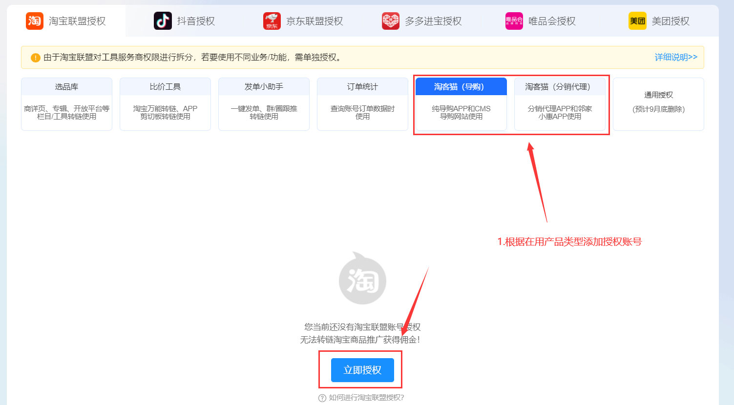 因淘宝联盟要求不同业务场景(如导购、代理、返利)需使用不同的授权,我们将淘客猫授权拆分如下,请根据使用的产品类型进行重新授权: