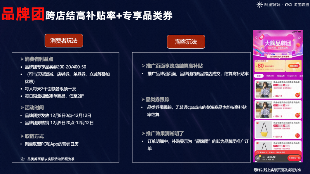 推广品牌团页面,品牌团内商品跨店成交,结算高补贴率
