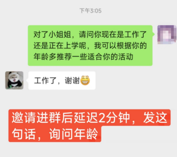 如上图,我们在邀请进群后延迟2分钟发送这段话(接粉软件可以设置),就可以得出粉丝年龄的大概情况。
