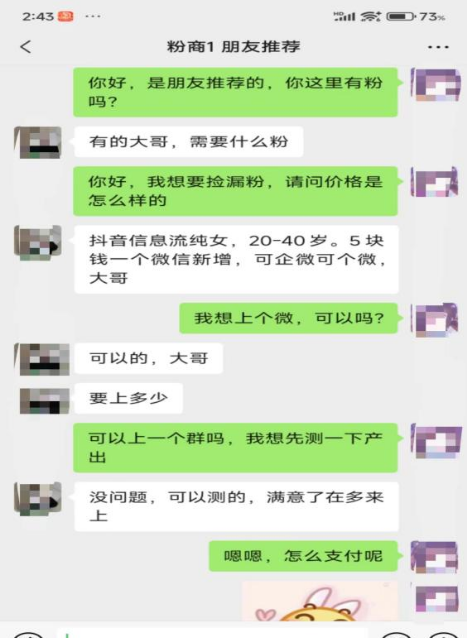 跟信息流公司不同,随着现在淘客规模越来越完善,已经有粉商这个行业了。比如某家公司跑的信息流户不可以停,但是自己又吃不下这么多粉,多余的粉就会交给粉商来转卖。我们找到粉商买粉的好处就是,价格透明基本上一开始就能估算出一个群的成本。而且可以随跑随停,很适合小规模的淘客。所以我们首先要找到粉商,一般靠朋友推荐,或者靠谱的淘客广告,我们都能加到一些粉商。接下来我来分享一下跟粉商沟通的技巧。