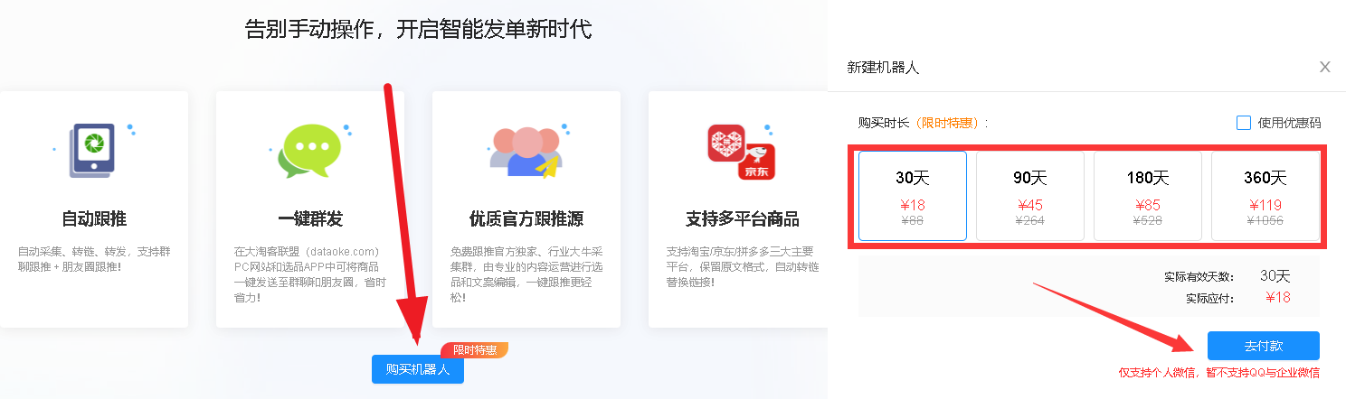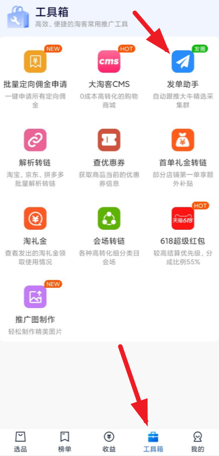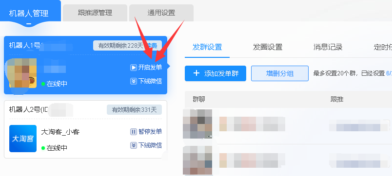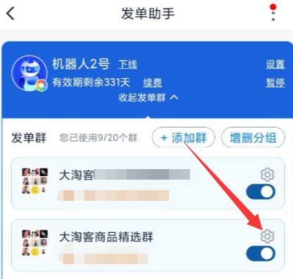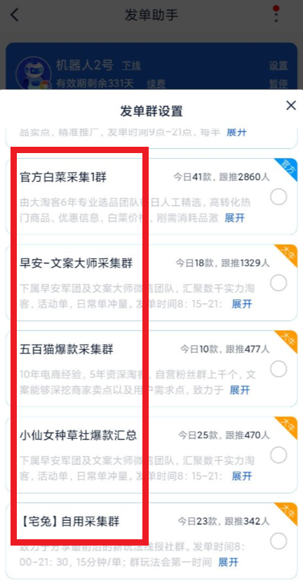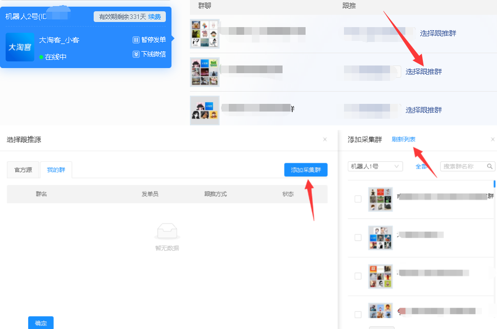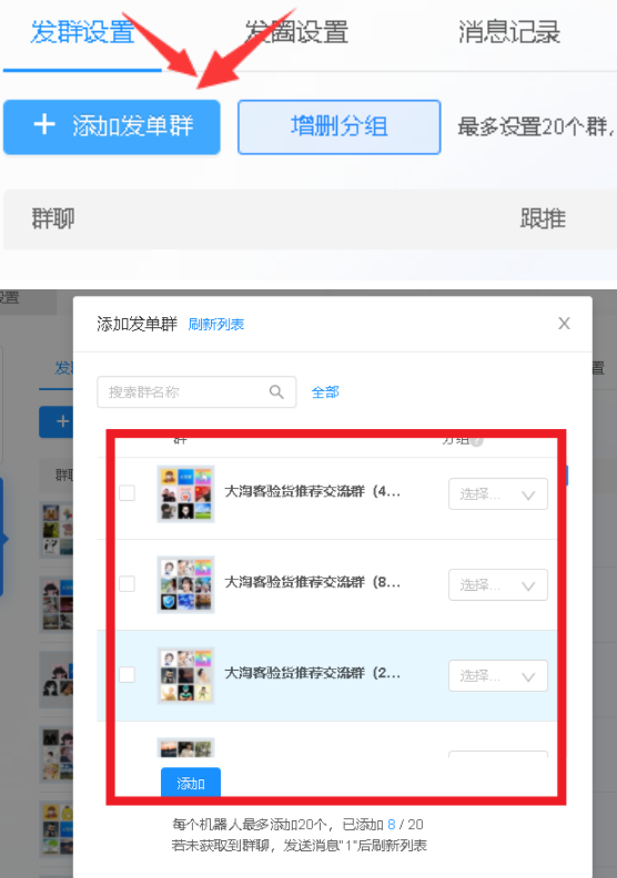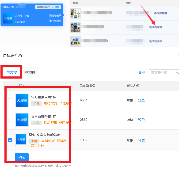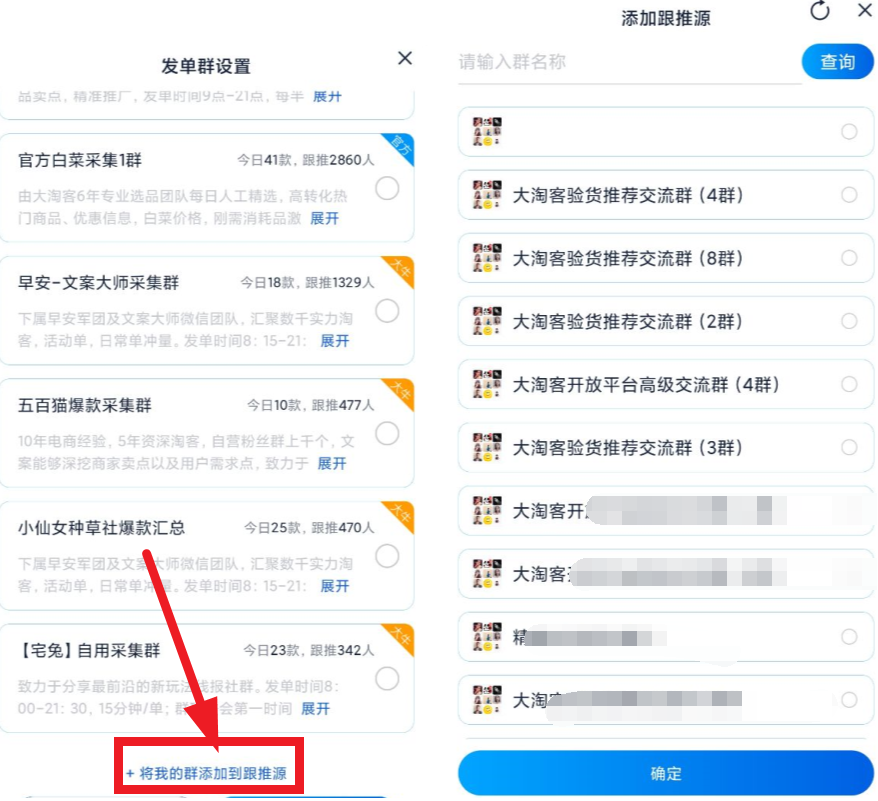 ①发单小助手页面添加,点击“选择跟推群”-在官方源中选择大淘客官方群即可。