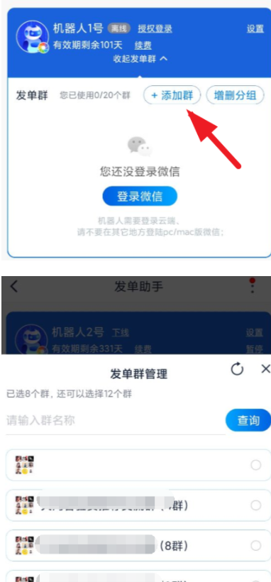 选择自己要发单的社群,如未显示,将群保存至通讯录,同时在群内发送“1”,稍等5分钟再选择。