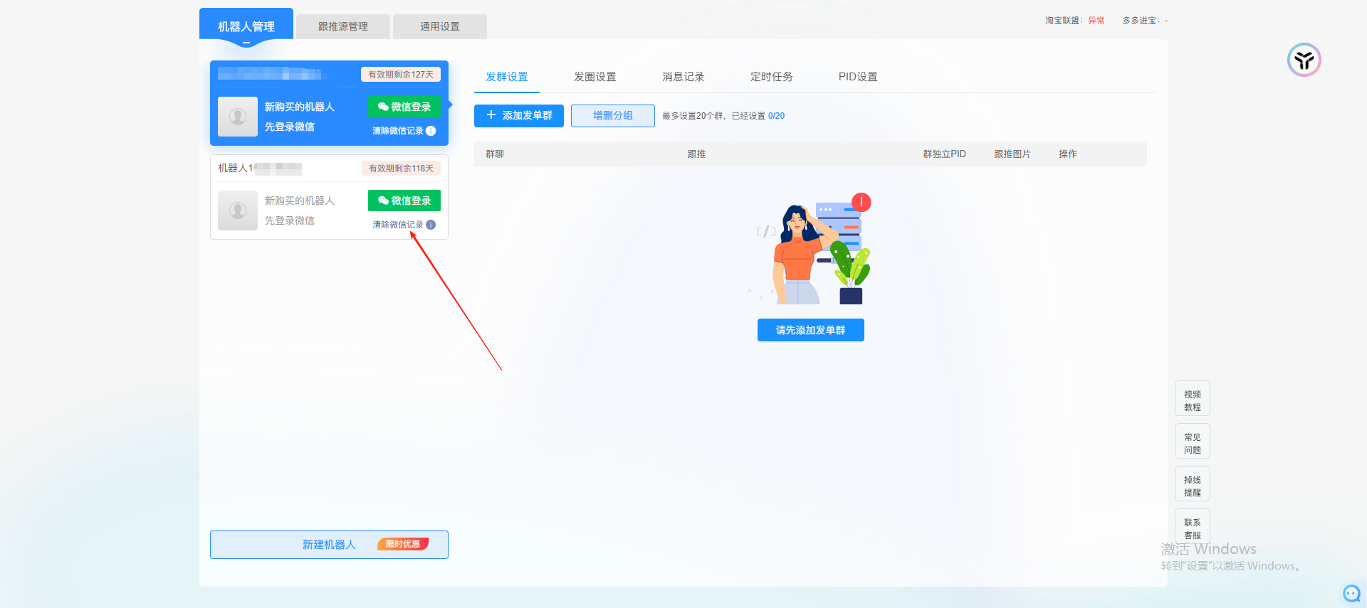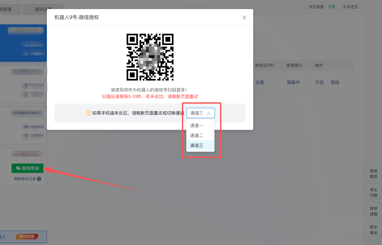 切换至通道二或通道三之前,务必先 “清除微信记录”,再重新选择通道登录。