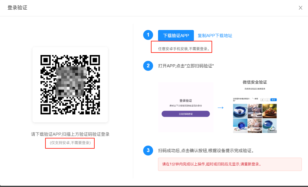 并用该 APP 扫描弹出的验证二维码完成验证,验证时间需控制在 1 分钟以内,完成后即可正常登录。