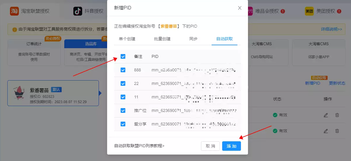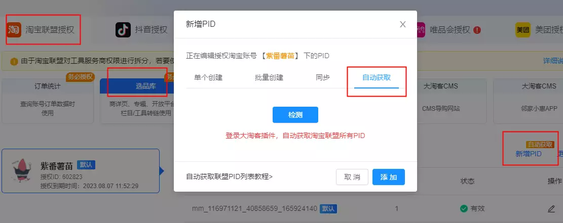 1、在统一授权中心 - 淘宝联盟授权 - 任意业务内 新增PID - 自动获取 - 点击检测
