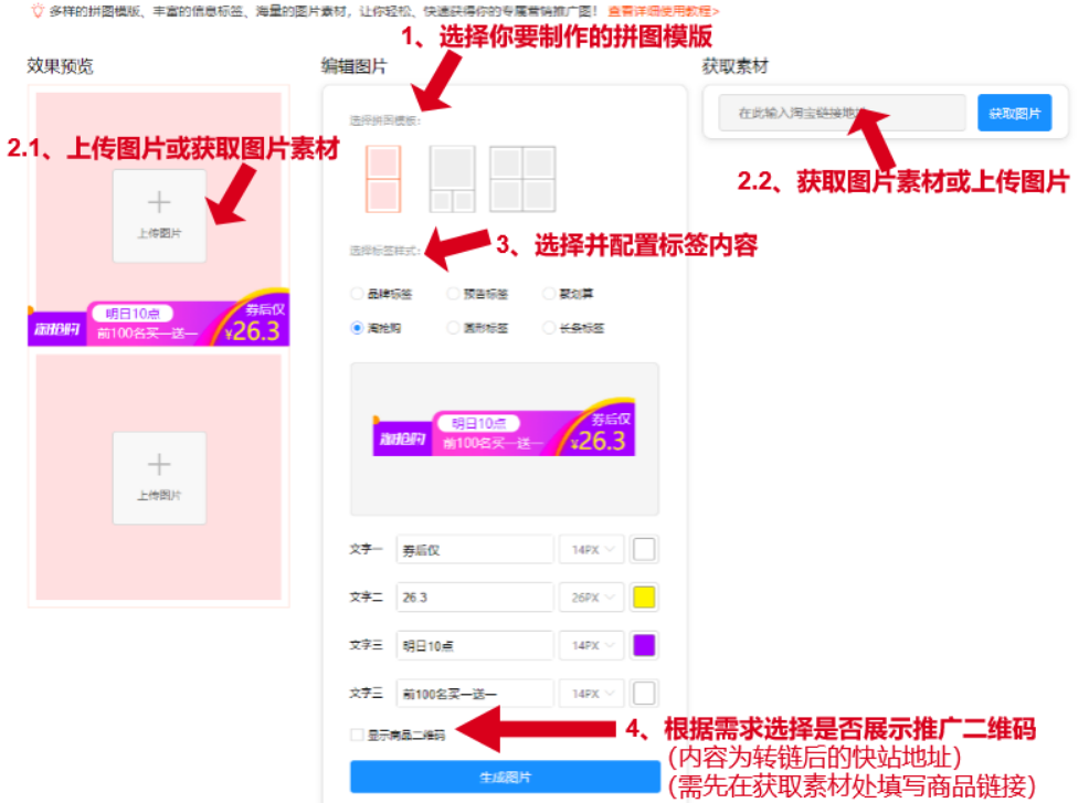 选择要制作的模板,然后上传图片,选择需配置的标签样式,然后生成图片发到推广群中。(详细操作可见下图)