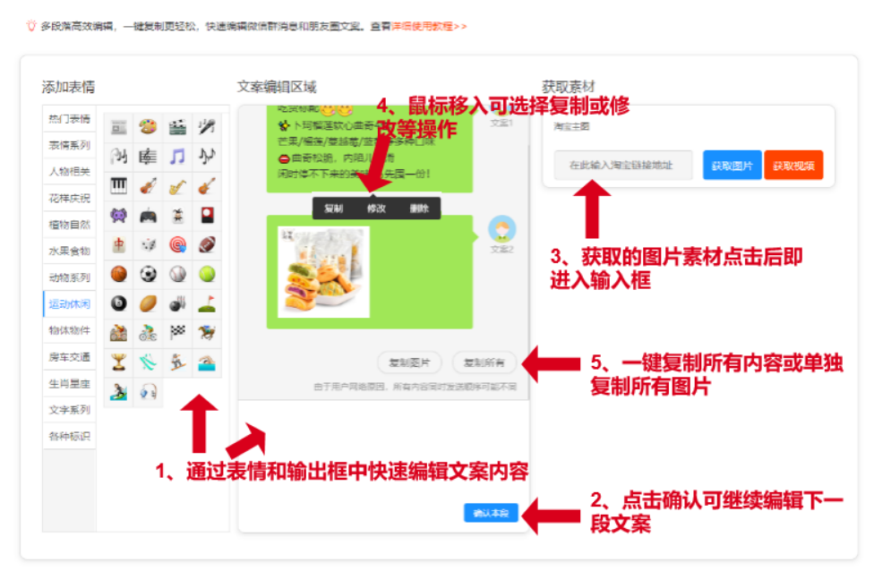 在输入框中编辑文案,右边可自定义选择表情,点击确认即可。要添加商品图片,那么复制商品链接即可获取素材,添加到文案编辑区域即可,编辑完之后复制所有即可在发在推广群。