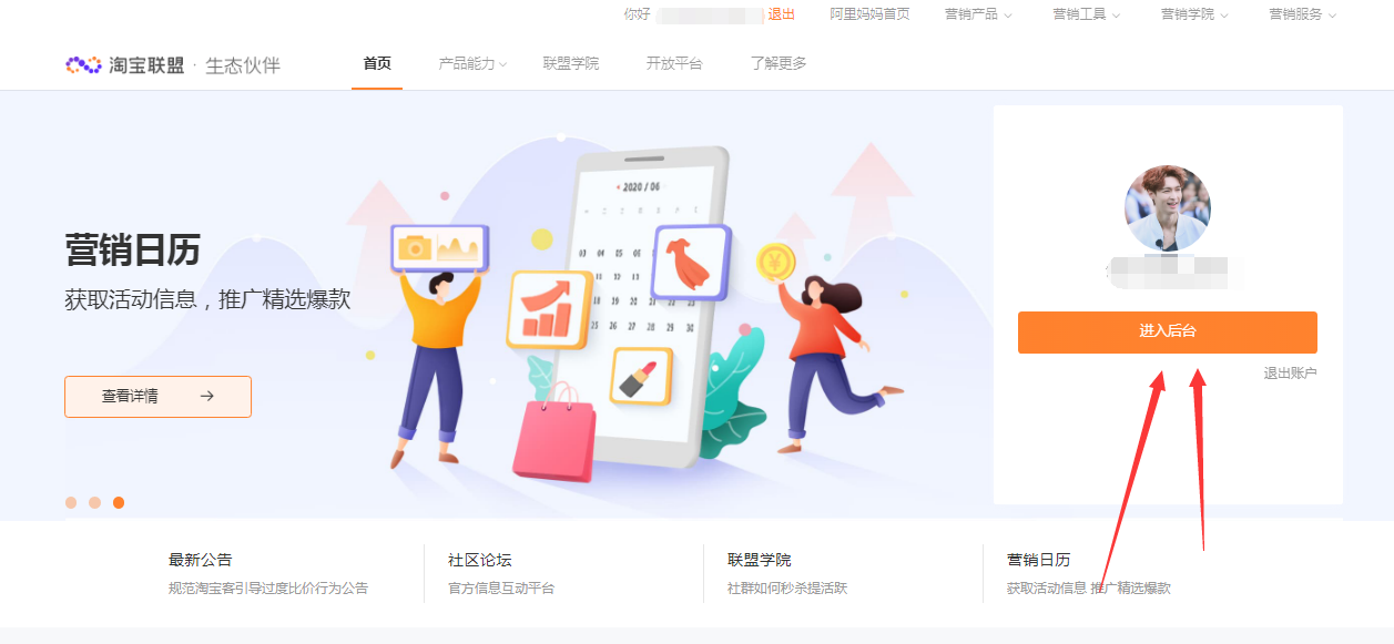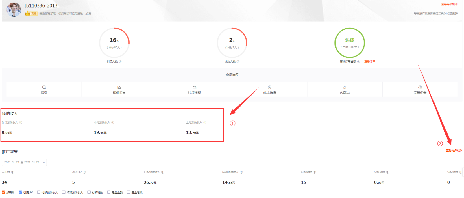 进入到淘宝联盟,登录后进入后台(下图1)即可查看账号等级以及佣金获得情况。