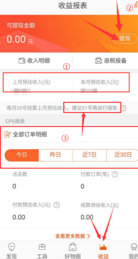 2)收益查看位置:点击下方“收益”即可查看(下图①)/提现(下图②)佣金收入,订单明细(下图③)。