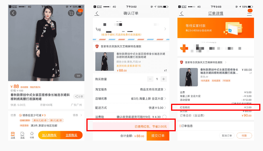 3、消费者提交订单时,会直接扣减“淘礼金”(“淘礼金”会自动和其他优惠同时扣减,其他优惠包含:福利红包、其他红包等)。